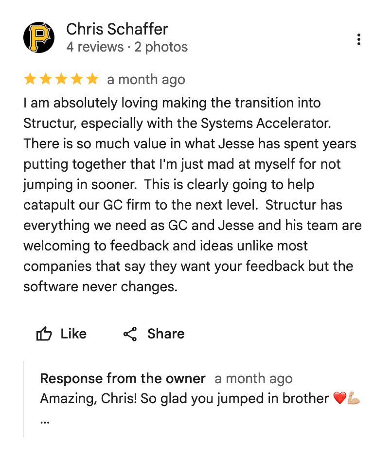 I'm Jesse Lane, owner of Structur Inc and previous owner of a construction company which was acquired by another local GC.