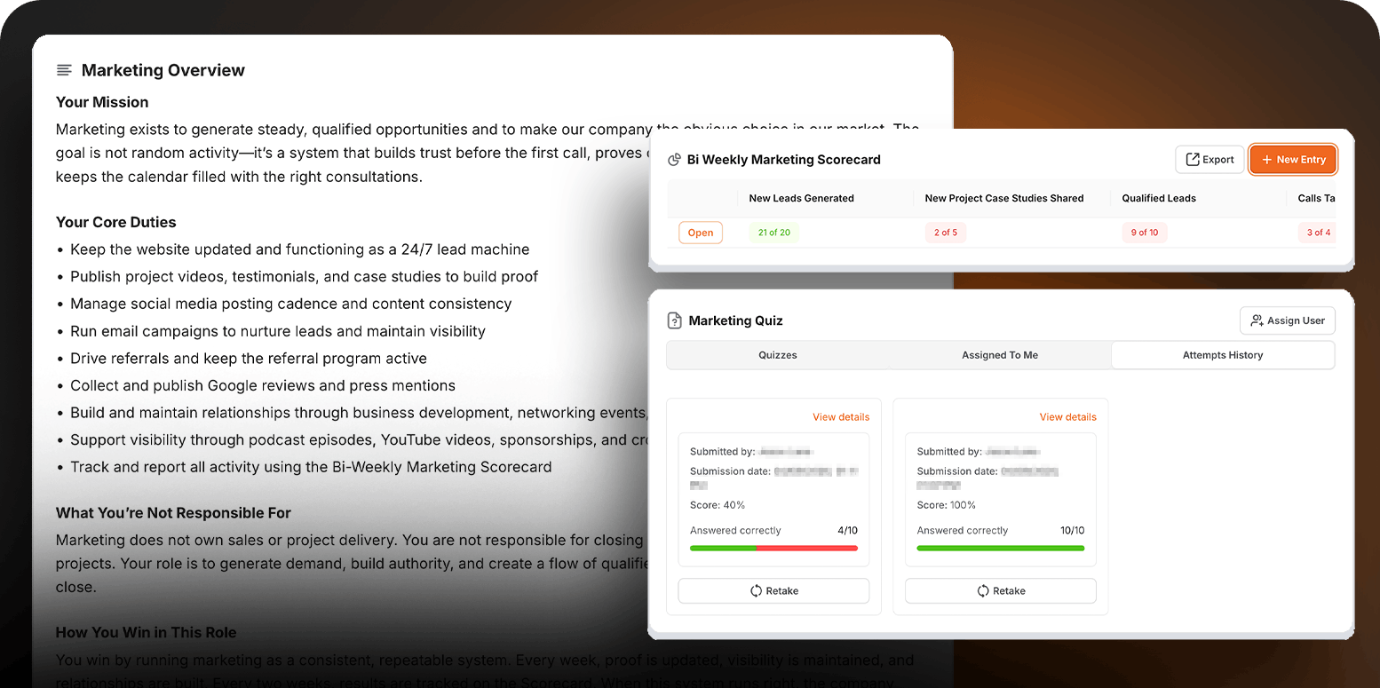 The Systems Every business function a contractor needs to master, broken down into documented, repeatable processes: Marketing, Sales, Estimating, Project Management, Field Management, Office Management, Bookkeeping, and Human Resources. Over 100+ ready to use process pages.