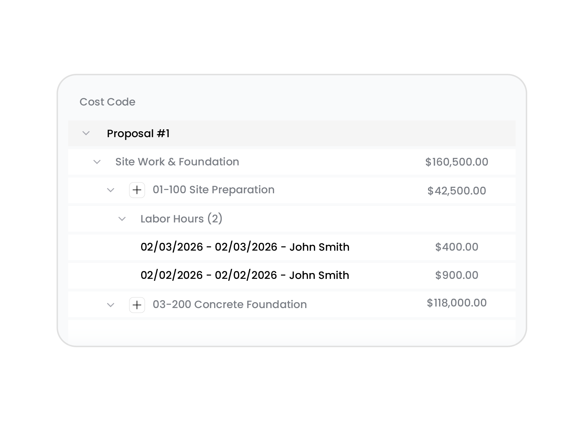 Cost codes and categories clearly organized